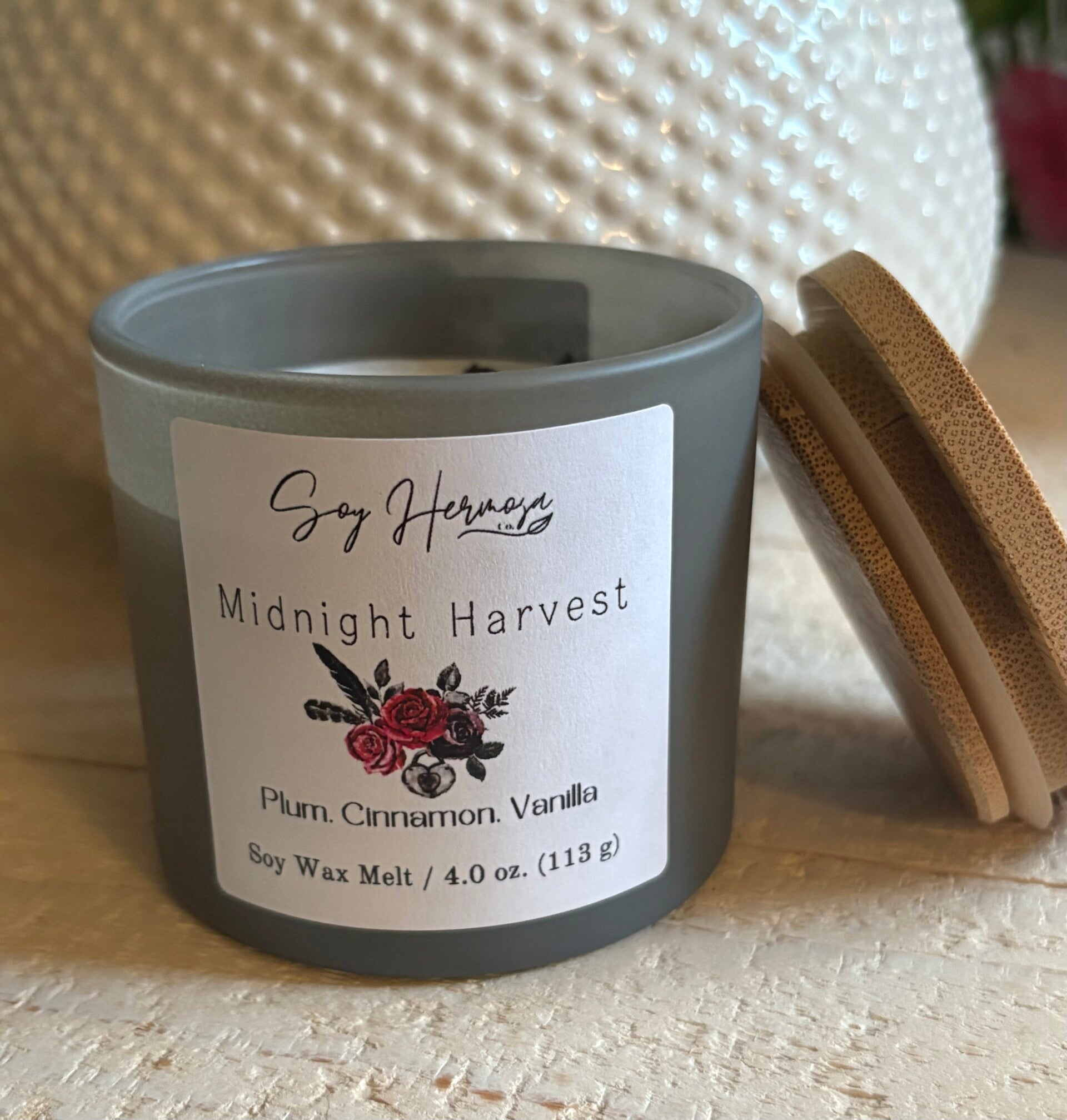 Our Midnight Harvest 4oz mini wickless candle comes with a wooden lid, envelops your space in the rich, layered aroma of ripe plum, spiced cinnamon, and creamy vanilla, evoking the warmth of a quiet magicical autumn night.